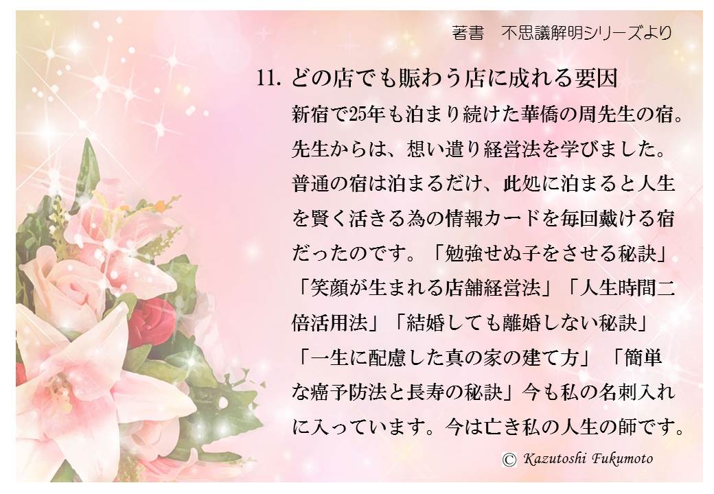 また、25年間状況の際に泊まり続けた、新宿の台湾華僑、周先生との出逢いから思考法が